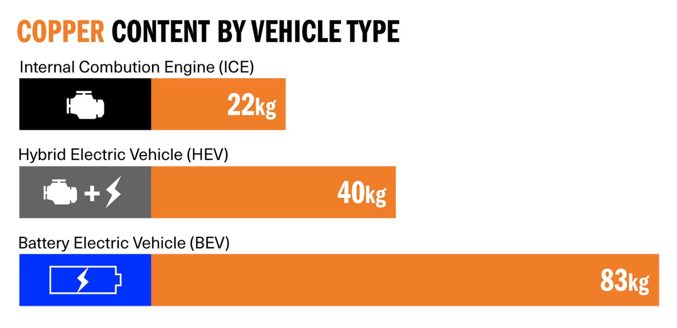 Měď hraje v automobilovém průmyslu zásadní roli, ať už je zdrojem paliva benzín, nafta, elektřina, palivové články nebo LNG. Očekává se, že poptávka po mědi ve vozidlech vzroste ze 3 milionů tun (MT) v roce 2023 na 5 MT do roku 2034. Skutečnou hnací silou je zde výrazný nárůst využití mědi pro komponenty elektrických vozidel (EV) v důsledku delšího dojezdu, který spotřebitelé od EV požadují, přičemž kapacita bateriových sad se zvyšuje tempem ~10 % ročně. Větší akumulátory, větší měniče a rychlejší nabíjení vyžadují větší proudovou kapacitu, což znamená, že jsou zapotřebí silnější spoje s nižším odporem.