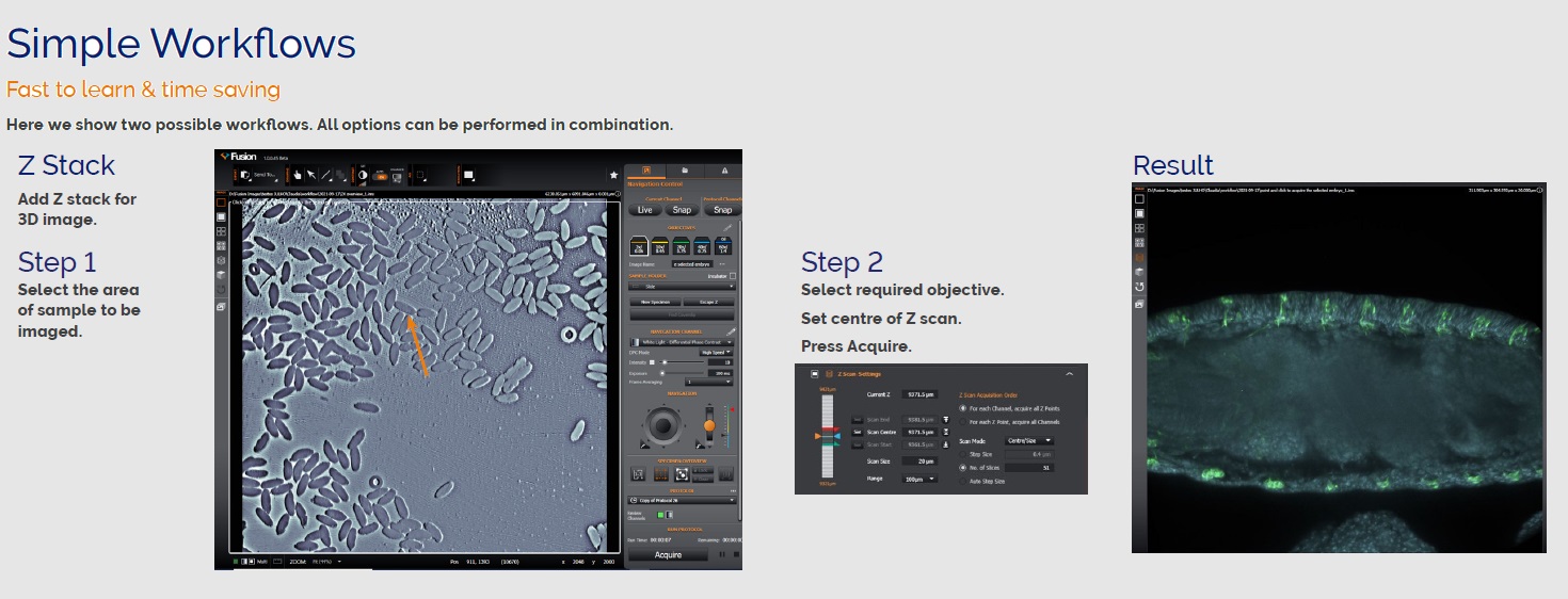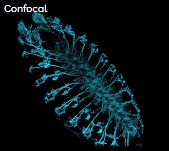 Technologie konfokálního zobrazování poskytuje vysoký kontrast a ostrost, což zvyšuje kvalitu snímků nejen tenkých vzorků, jako jsou jednovrstvé kultury, ale vhodné je pak zejména pro tlustší vzorky (malé organismy, 3D kultury, vzorky tkání aj.)