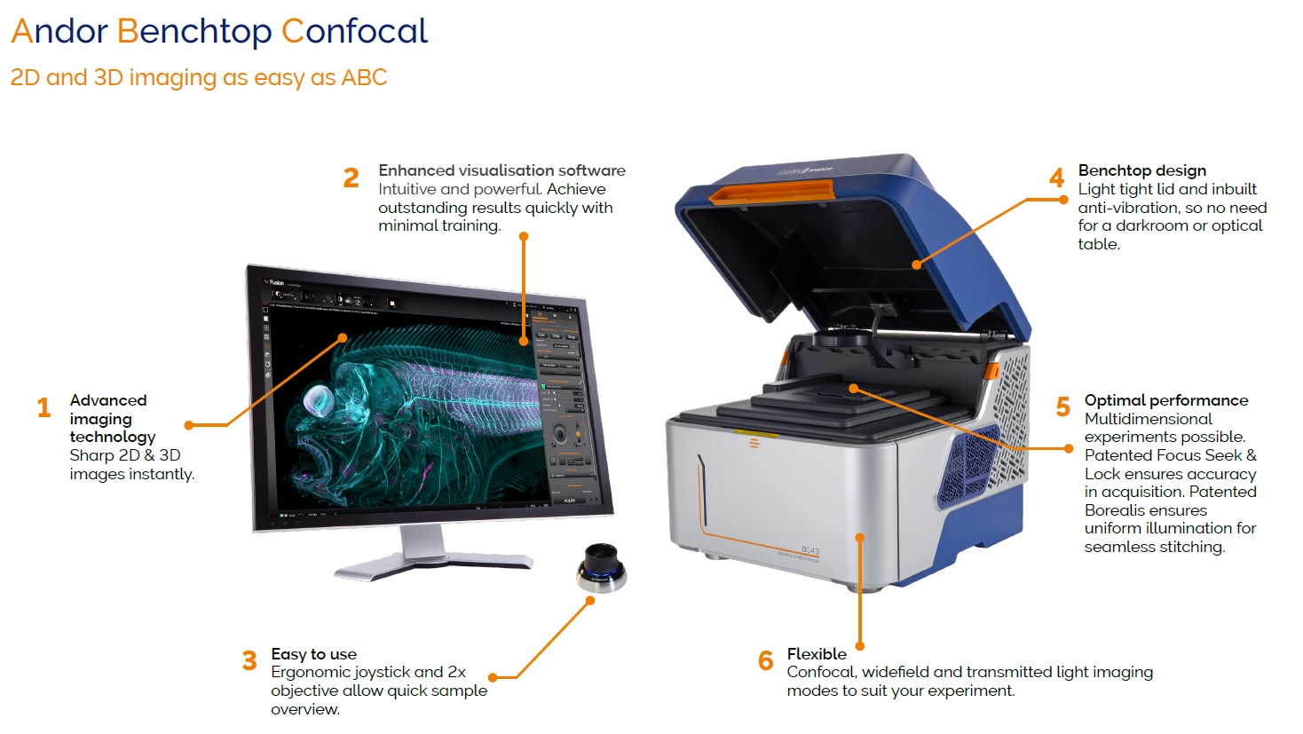 Oproti bodovým skenovacím konfokálním mikroskopům zachycuje Andor BC43 CF snímky více než 10x rychleji při zachování plného rozlišení. Stejně jako Dragonfly systém, je i nový BC43 CF mikroskop založen na bázi spinning disku (dvojice tzv. "pinhole disku" s pinholes a "collector disku" s mikročočkami). Vysoce citlivý vysokorychlostní sCMOS detektor pro krátké expozice a redukci photobleachingu je ideální volbou pro konfokální zobrazování živých buněk, maximalizuje počet buněk v jednom snímku a efektivně zachycuje i velké vzorky s velkým zorným polem. Díky vysokému dynamickému rozsahu zaznamená slabé a jasné signály v jednom snímku bez saturace.