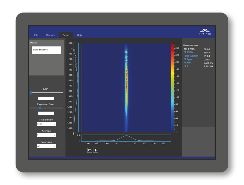 Software pulseCheck Single je navržen pro maximální použitelnost bez kompromisů. Jeho přehledné moderní rozhraní umožňuje plnou kontrolu všech parametrů zařízení pouhými několika intuitivními kliknutími. Software poskytuje širokou škálu parametrů a statistik. Sledujte autokorelační křivku, vlastnosti svazku, délku pulzu podél profilu svazku, zaměření svazku, stabilitu energie a další údaje na první pohled. Ukládejte svá data a snadno je porovnávejte s předchozími výsledky.