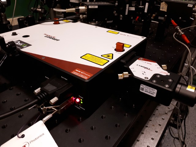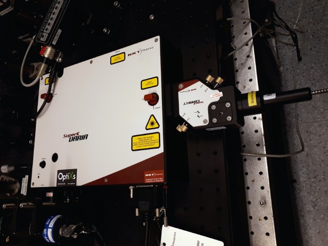 - Laser generující superkontinuum SuperK EXTREME EXW-12 s opakovací frekvencí 78 MHz, výstupním výkonem 1,2 W ve viditelné spektrální oblasti a spektrálním výstupem v rozsahu ~455 nm až ~2350 nm. Laser se dále vyznačuje velmi dobrou časovou stabilitou výstupního výkonu < 0,5% a excelentními parametry svazku M2 < 1,1, divergence svazku < 5 mrad