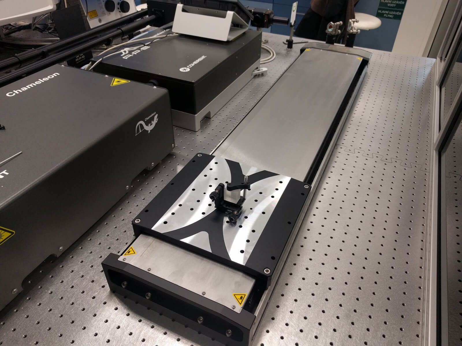 Pro servisní laboratoř Zobrazovacích metod na BIOCEV jsme ve spolupráci s firmou Carl Zeiss realizovali upgrade stávajícího vybavení (konfokálního mikroskopu s laditelným femtosekundovým laserem Coherent Chameleon Ultra II rozšířeným o OPO jednotku), a to pomocí zpožďovací linky, tvořené přesnou lineární osou LMS-270 od firmy Physik Instrumente, a prechirp jednotky od firmy APE.